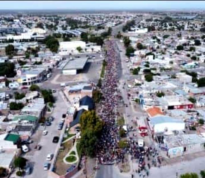 La caravana que según muestra la fotografía captada por un dron fue muy extensa recorrió las calles de la ciudad capital, con banderas argentinas, pancartas de rechazo a la actividad extractiva, repitiendo permanentemente “no es nó”.