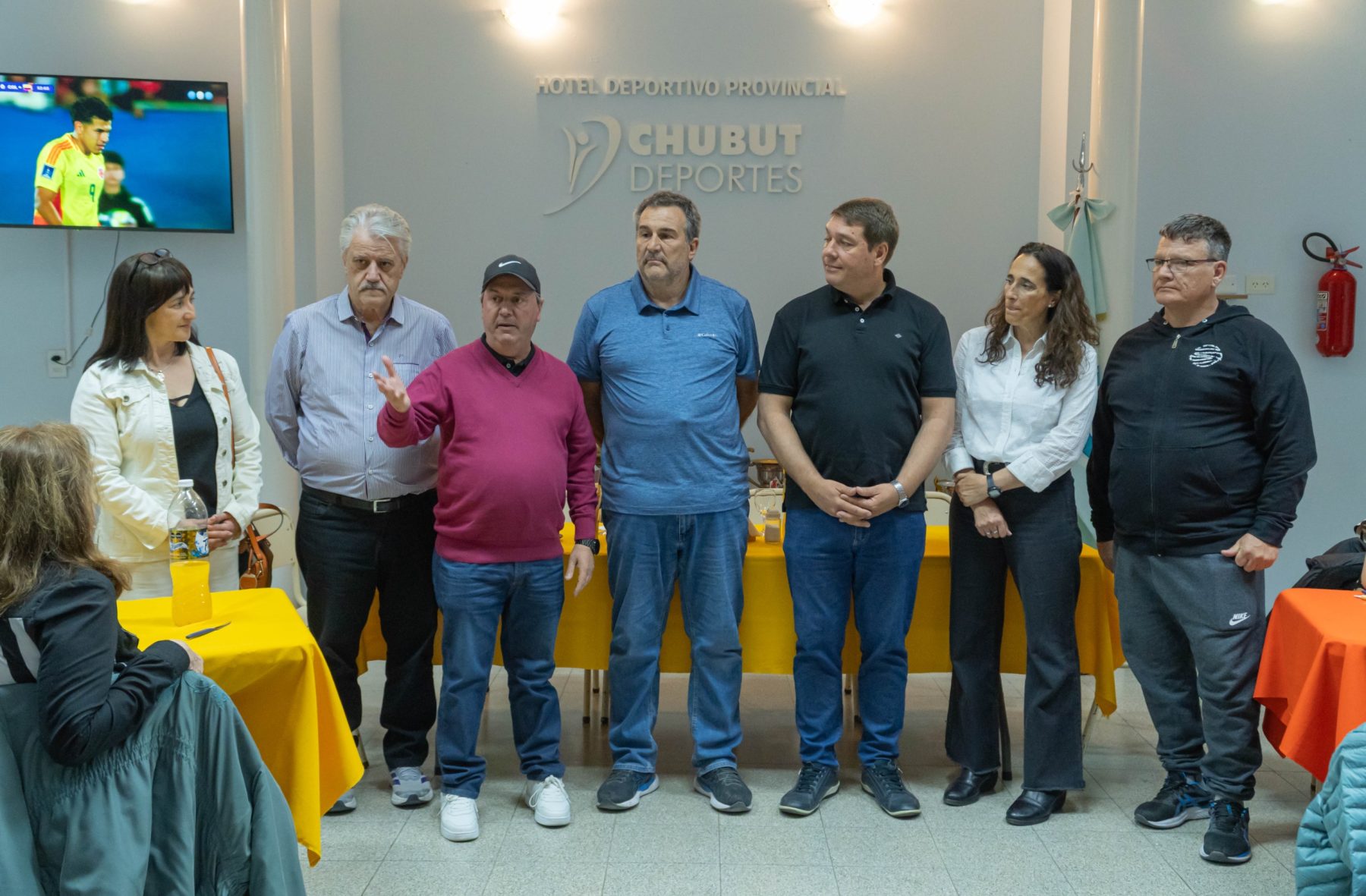 El intendente de Rawson, Damián Biss, mantuvo un encuentro con los periodistas en las instalaciones del Hotel Deportivo Provincial, acompañado por la gerente del Ente Mixto Rawson Turístico (EMRaTur), Natalia García; el presidente del Círculo de Periodistas Deportivos del Chubut, Darío Santos; el presidente de la Federación Argentina de Periodistas Deportivos (FAPED), Santiago Veiga; y la integrante del Directorio de Chubut Deportes, Alejandra Ibrahim.