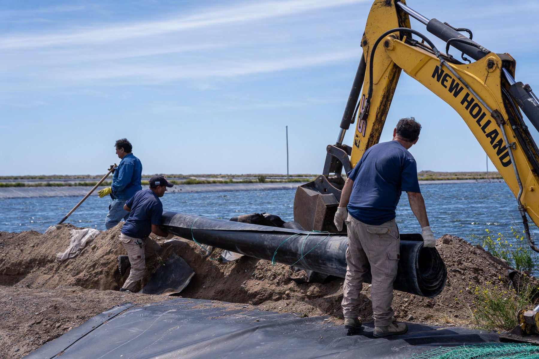 Los trabajos se están realizando en la primera laguna, que fue el lugar donde se robó la mayor parte de la geomembrana. Roberts destacó que es fundamental realizar un anclaje especial utilizando las herramientas adecuadas, razón por la cual esta obra está siendo ejecutada por una empresa de Río Negro, con un plazo de finalización estimado entre este lunes y martes.