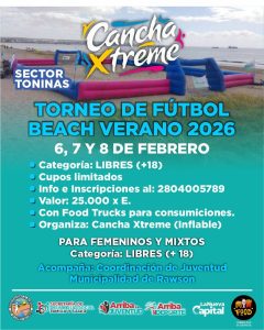 Dentro del cronograma de actividades deportivas que se desarrollan durante el próximo fin de semana, la Municipalidad de Rawson acompaña la realización del Torneo de Fútbol Beach Verano 2026, organizado por Cancha Xtreme; una propuesta deportiva que se desarrollará los días 6, 7 y 8 de febrero en el sector del Monumento a las Toninas de Playa Unión.