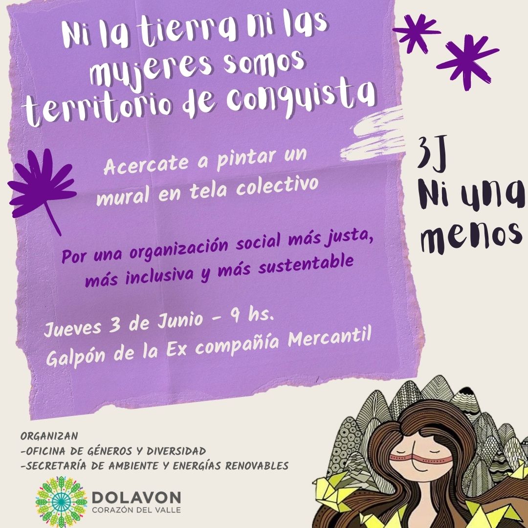 Bajo la consigna “Ni la tierra ni las mujeres somos territorio de conquista”. la municipalidad de Dolavon convoca a las mujeres para sumarse a la pintura de un mural colectivo en tela.