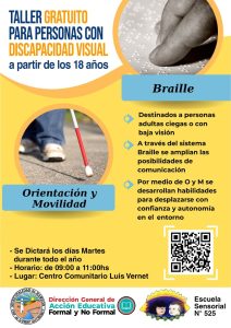 El taller está dirigido a personas adultas ciegas o con baja visión y aborda contenidos vinculados a la lectoescritura en sistema braille, orientación y movilidad (OM), concientización de los sentidos, conceptos y técnicas de búsqueda, con el propósito de mejorar la capacidad de desplazamiento autónomo, garantizando una propuesta pedagógica inclusiva y de calidad.