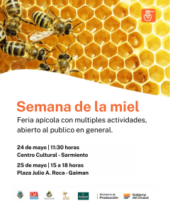 Para esto, el Ministerio de Producción estará presente en las actividades que se realizarán este sábado 24 de mayo en Sarmiento a partir de las 11:30 horas en la Feria de Apicultores en el Centro Cultural local. Como parte de la agenda se brindarán charlas, habrá cocina en vivo y venta de productos entre otras propuestas. Además, se concretará una salida a partir de las 15 horas a conocer la sala de extracción de Miel con cupo limitado.