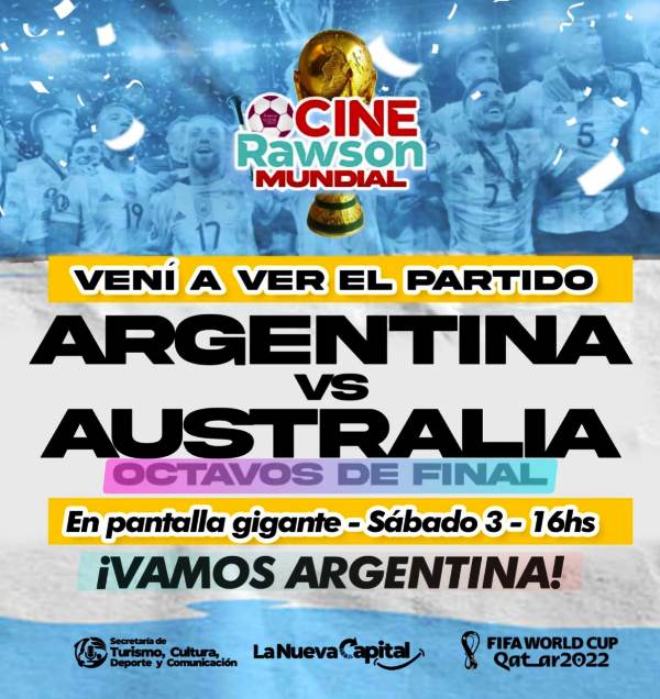 Bajo la consigna “Cine Rawson Mundial”, la Municipalidad de Rawson, invita a la comunidad capitalina a presenciar la proyección en pantalla gigante del cotejo de la Selección Argentina contra Australia este sábado a partir de las 16:00 horas