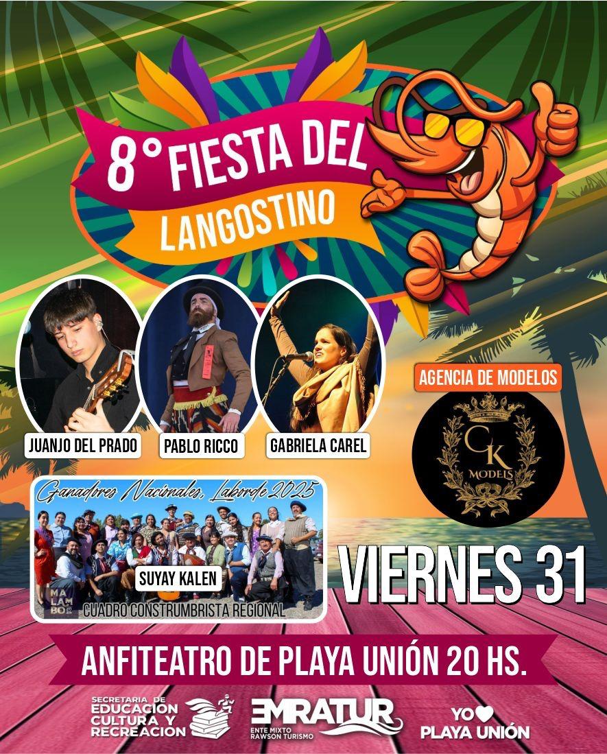 La Municipalidad de Rawson a través de la Secretaría de Educación, Cultura y Recreación, y el Ente Mixto Rawson Turístico, anuncia la octava edición de la Fiesta del Langostino, que se llevará a cabo el viernes 31 de enero y el sábado 1 de febrero, a partir de las 20 horas, en el Anfiteatro de Playa Unión.