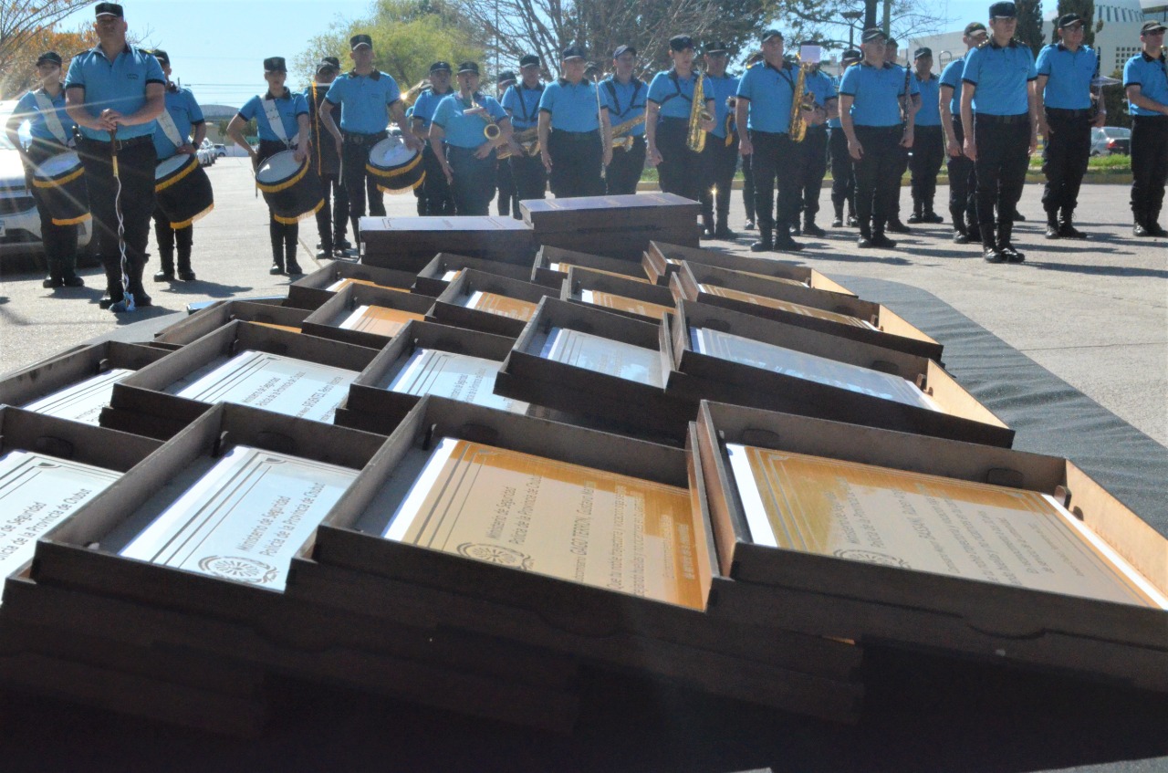 La ceremonia tuvo lugar en el acceso a las instalaciones de la Jefatura de Policía en Rawson, y participaron el jefe de la Policía del Chubut, César Brandt; la subsecretaria de Prevención y Participación Comunitaria, Sandra Muñoz, y su par de Seguridad, Rubén Becerra; el subjefe de la Policía, Juan Cruz Campos, los Directores de la Plana Mayor, jefes de Áreas, personal policial en actividad, retirados, familiares e invitados especiales.