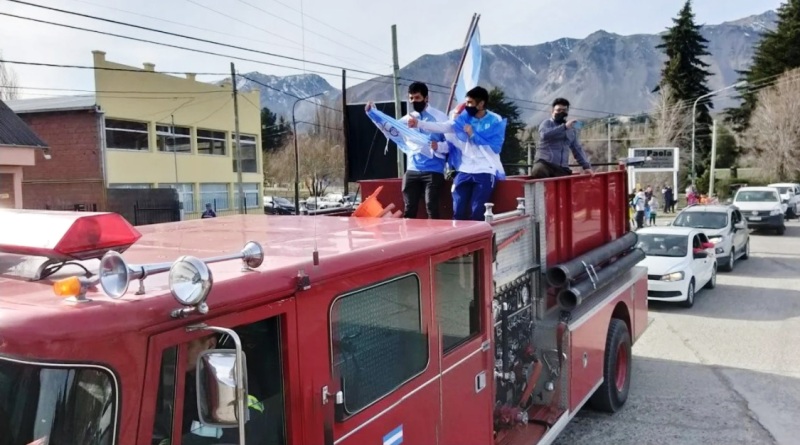 La llegada al aeropuerto de Esquel estuvo seguida por una caravana de vehículos hasta el centro donde los esperaba otro gran grupo de vecinos y la autobomba de Bomberos Voluntarios.