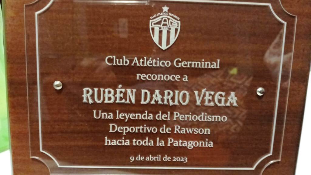Precisamente en la previa al trascendente partido que el Albiverde iba a disputar con su similar de Villa Mitre por el Federal B el presidente de la centenaria institución, Pedro Bravo González junto con integrantes de la comisión directiva le entregaron al director de FM Bahía Engaño y hermano de Rubén Darío, Aldo Juan Gabriel Vega una placa de reconocimiento y homenaje al querido colega. Debemos añadir que en el mismo acto se reconoció a un joven hincha de Germinal también fallecido en las últimas horas: Franco Ñancufil