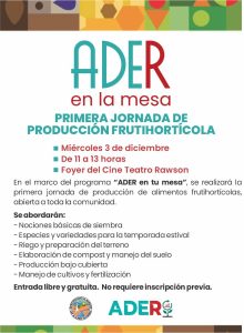 La Agencia de Desarrollo Económico de Rawson (ADER), dependiente de la Municipalidad de Rawson, invita a la comunidad a participar el 3 de diciembre de la 1° Jornada en Producción Frutihortícola “ADER EN LA MESA”, que se realizará a las 11 horas en el foyer del Centro Cultural “José Hernández”.