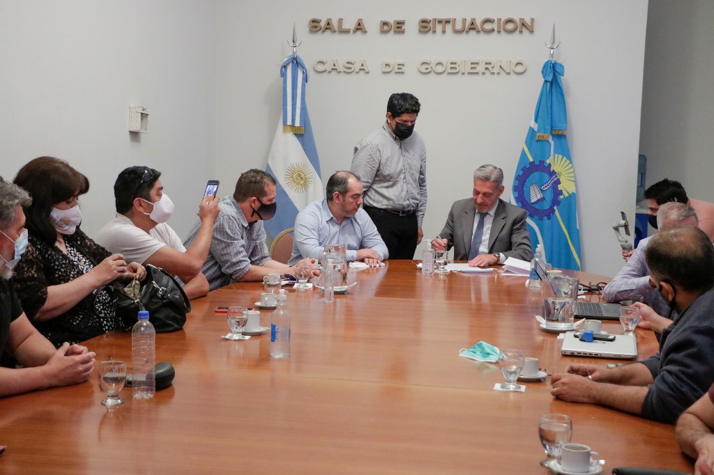El encuentro fue encabezado por el gobernador de la Provincia, Mariano Arcioni, y se realizó esta tarde en la Sala de Situación de Casa de Gobierno. Junto al mandatario provincial estuvieron el ministro de Economía, Oscar Antonena; el ministro de Gobierno y Justicia, José María Grazzini; el secretario de Trabajo, Cristian Ayala, y el subsecretario de Gestión Institucional, Mariano Cabrera