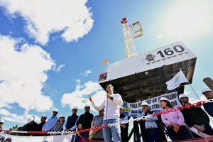 El gobernador del Chubut, Ignacio “Nacho” Torres, encabezó el acto de presentación del equipo que realizará el segundo pozo no convencional en Cerro Dragón, a partir de una millonaria inversión de la empresa Pan American Energy, en el marco del plan piloto para la reconversión de la Cuenca Golfo San Jorge.