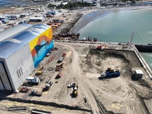 De manera paralela, continúa el movimiento de suelos en el sector donde se instalarán las nuevas vías de transferencia y gradas destinadas a la operación de buques con estándares modernos.