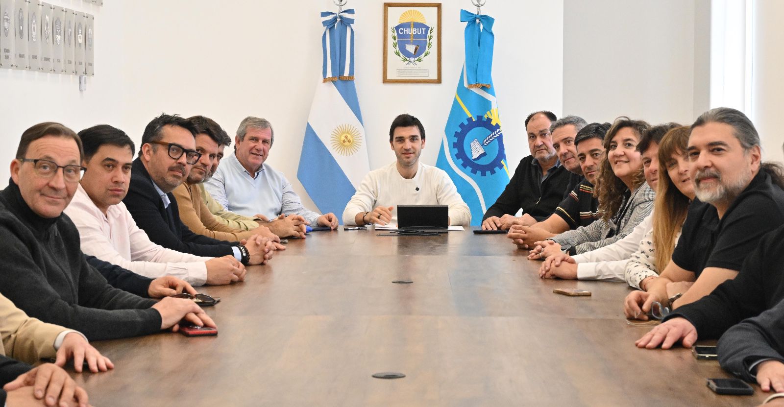 El gobernador Ignacio “Nacho” Torres recibió este miércoles en Rawson al presidente de la Federación Empresaria del Chubut (FECh), Carlos Lorenzo, y a representantes de distintas Cámaras de Comercio, Industria y Producción de la provincia. Durante el encuentro realizado en la Sala de Situación de Casa de Gobierno, se abordó un amplio temario vinculado con la actividad productiva regional y el trazado de un esquema de trabajo coordinado entre los sectores público y privado para “fortalecer la industria local y sostener los puestos de trabajo en un contexto económico desfavorable a nivel nacional”.