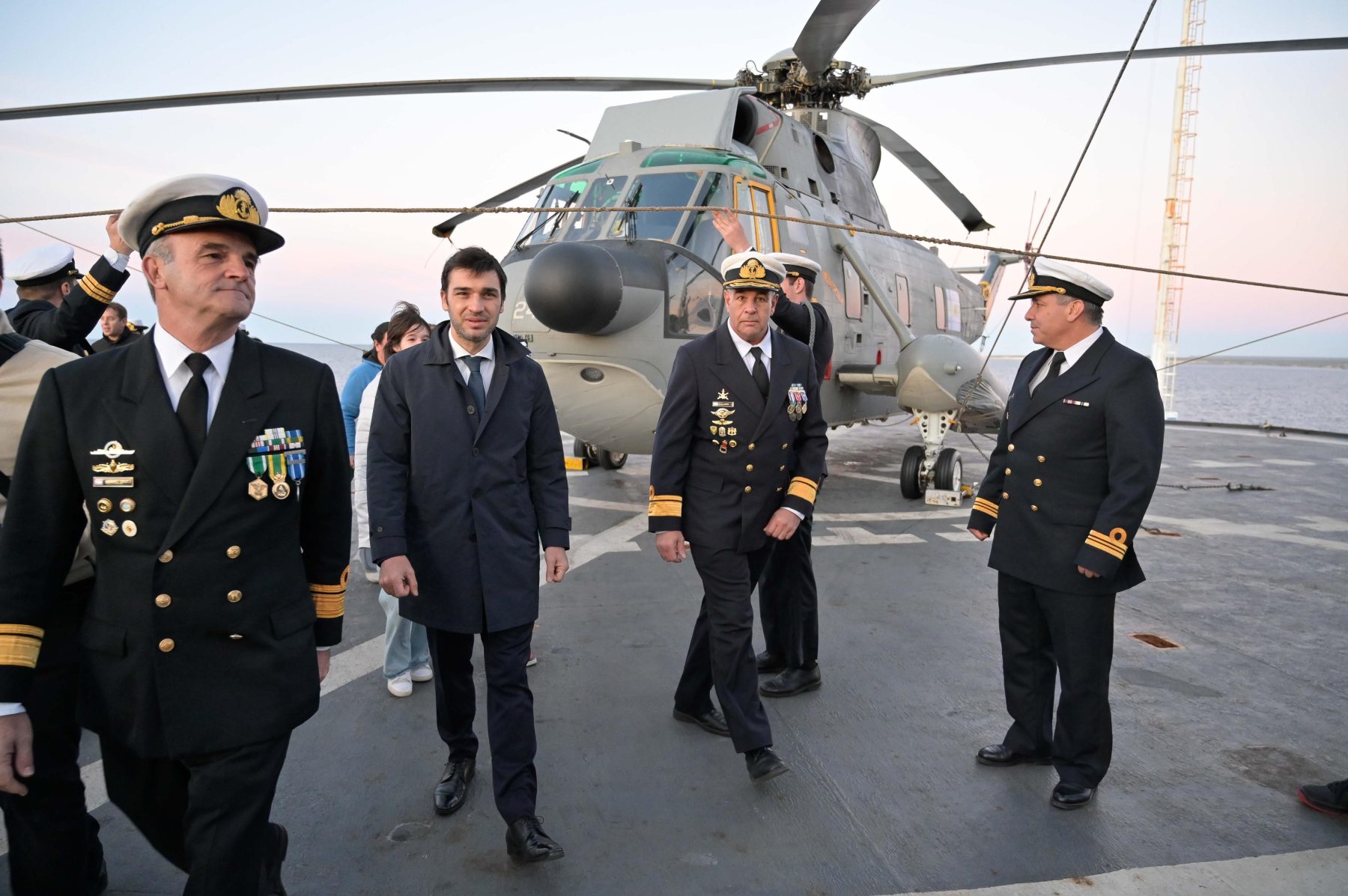 Participaron del encuentro el capitán del buque, Sebastián Alejandro Musa; los comandantes de la Flota de Mar, José Alberto Martí Garro; de la Infantería de Marina, contraalmirante de Infantería de Marina, Javier Pedro López; de Transporte Navales e instrucción, capitán de Navío, Federico Garat; de la Fuerza Aeronaval Número 3, capitán de Navío, Gabriel D’Alessandro; el presidente de la Administración Portuaria de Puerto Madryn (APPM), Diego Pérez.