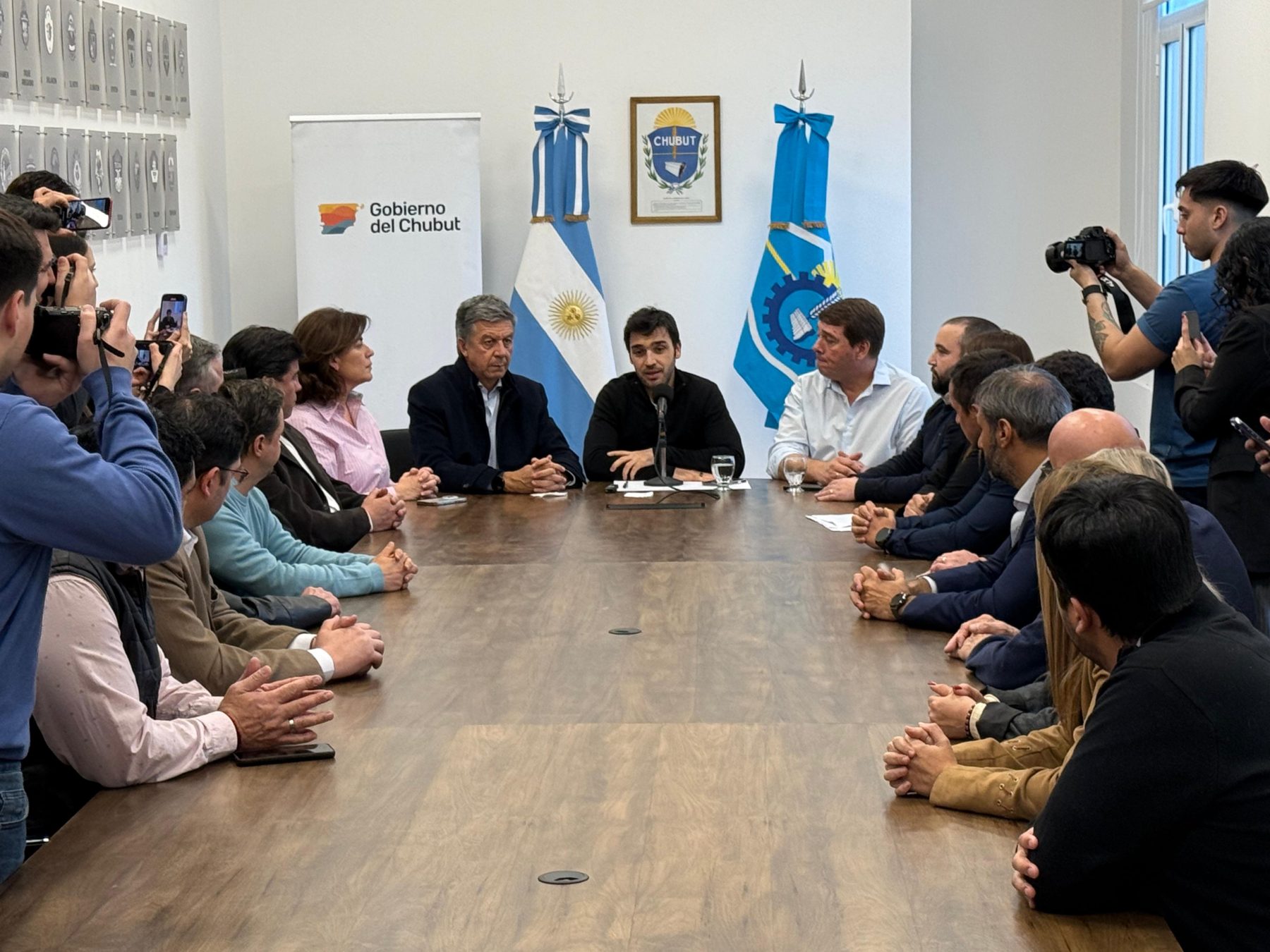 El anuncio tuvo lugar en la Sala de Situación de la Casa de Gobierno. Acompañaron al mandatario el vicegobernador Gustavo Menna; la diputada nacional Ana Clara Romero; el intendente de Rawson, Damián Biss; el secretario de Infraestructura, Energía y Planificación de Chubut, Hernán Tórtola; la directora general de Puertos de Explotación Directa, Dra. Gisela Silva; el presidente del Concejo Deliberante de Rawson, concejales y demás funcionarios municipales.