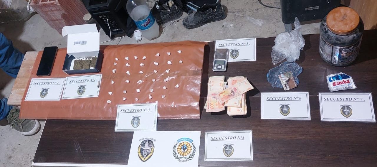 La Policía del Chubut, a través de la División Drogas de Puerto Madryn, realizó dos allanamientos en distintos sectores de la ciudad, y como resultado de los operativos se detuvieron a 2 personas, se incautaron 35 dosis de cocaína, marihuana compactada, dinero en efectivo, un revólver calibre 22, una computadora, una balanza de precisión junto con otros elementos útiles para sustanciar la causa.