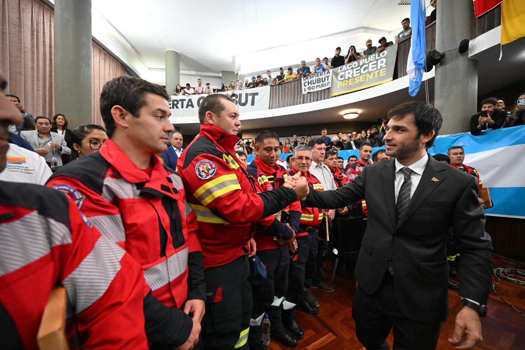 Torres inició su alocución pidiendo “un fuerte reconocimiento y aplauso a los verdaderos héroes de este año, que pusieron el cuerpo, arriesgaron su vida y mostraron que nuestros brigadistas y bomberos voluntarios son el ejemplo de resiliencia y vocación de servicio, siendo un orgullo para todos los chubutenses”, lo cual derivó en una extensa ovación de todos los presentes, con el saludo personal del Gobernador, quien descendió al recinto para felicitar a cada uno de los representantes de dicho sector.