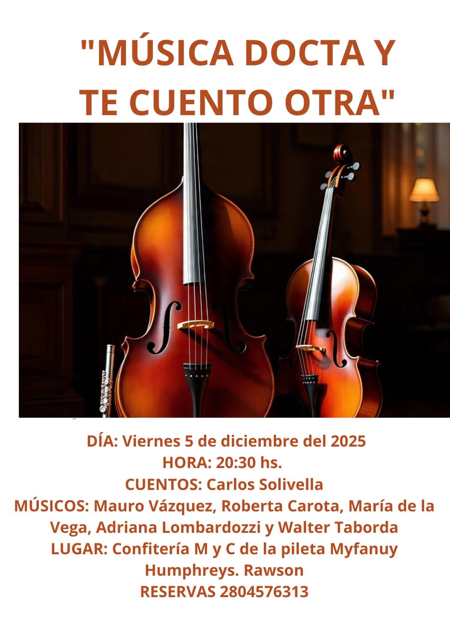Este viernes 5 de Diciembre a las 20:30 horas, en la capital provincial, habrá una noche distinta, con arte y buen sabor. En la confitería M&C, ubicada en la Asociación Myfanuy Humphreys, se presentará un nuevo espectáculo: “MÚSICA DOCTA Y TE CUENTO OTRA”.