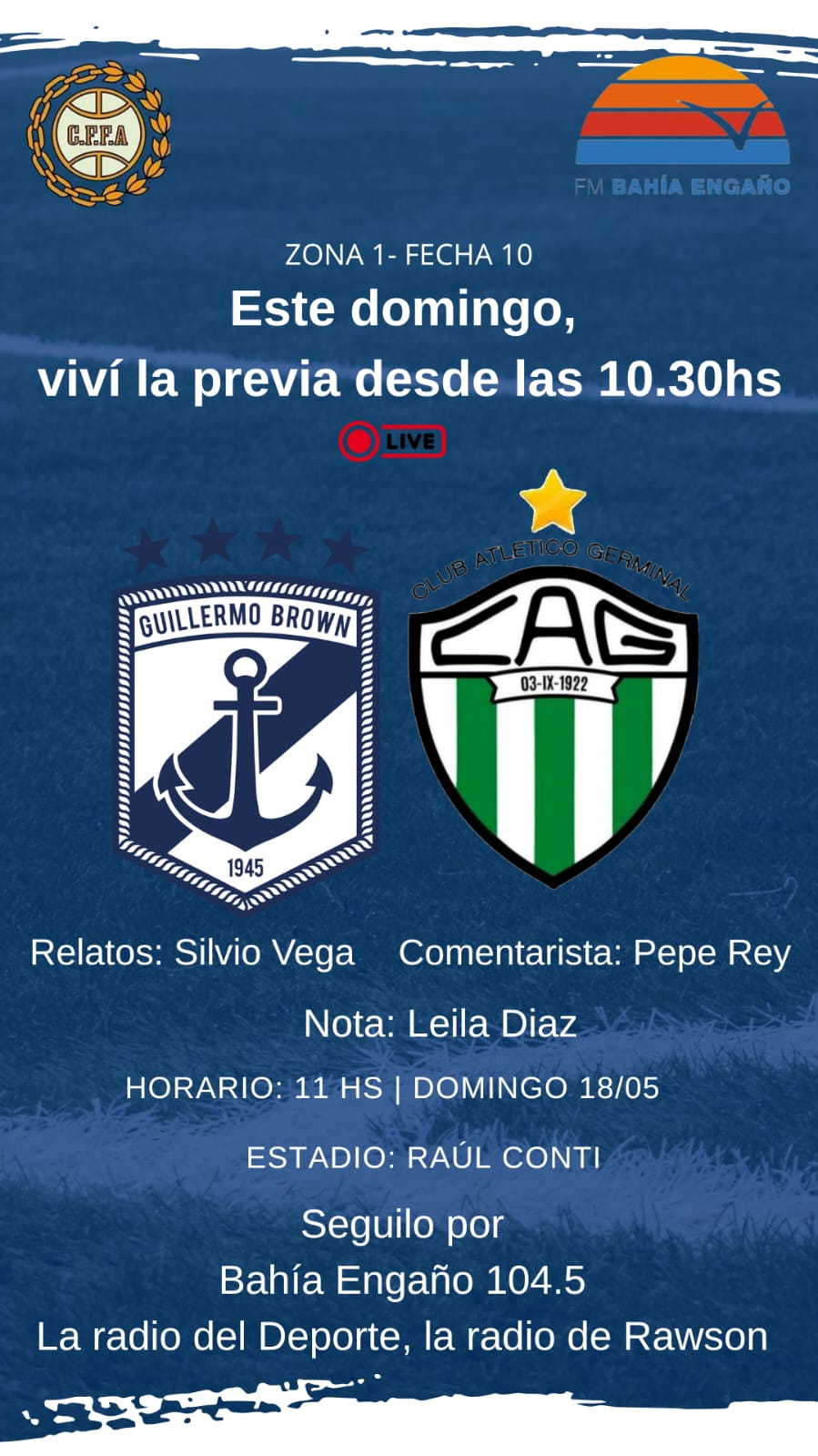Este Domingo 18/05 desde las 10:30 por la 104.5 de Rawson, Chubut vamos a estar en vivo transmitiendo el partido de la Zona 1 (Fecha 10): Guillermo Brown y Germinal. Desde el estadio “Raúl Conti” estará relatando Silvio Vega, comentarios “Pepe” Rey y notas por Leila Díaz.